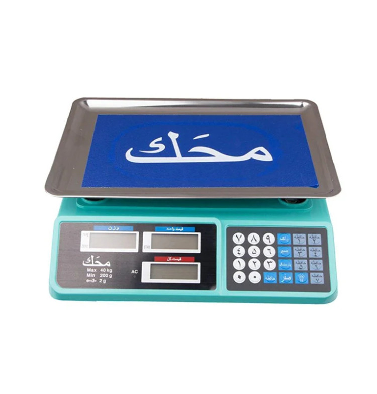 سایر مشخصات ترازوی 40 کیلویی محک با دقت 2 کیلوگرم محصولی از کشور چین است که در فروشگاه هایی با حجم کاری کم و سایر خرده فروشی ها مورد استفاده قرار می گیرد . ترازوی کمری از دو منبع برق و باتری قابل شارژ انرژی را ذخیره می کند و قادر است تا ساعت ها از طریق باتری عملیات وزن کشی را پشتیبانی نماید . ترازو فروشگاهی محک 40kg از ابعاد کوچک و وزن کمی برخوردار است و به راحتی قابل جا به جایی است . این ترازو از جنس پلاستیک فشرده ساخته شده است و جهت جلوگیری از نفوذ گرد و غبار و رطوبت به کاور تلقی مجهز شده است . برای ذخیره کالاها در ترازو به 7 حافظه دسترسی خواهید داشت تا محصولات پرفروش خود را در آن ثبت نمایید . در کنار این ویژگی ها ترازو فروشگاهی محک 40kg امکان توزین پی در پی را نیز برای شما میسر می سازد . این ترازوی فروشگاهی فاقد ستون نمایشگر است و نشانگرها در 3 ردیف شامل وزن ، قیمت واحد و قیمت کل بر روی بدنه قرار گرفته است که هر دو طرف ( مشتری و خریدار ) را پشتیبانی می کند . ترازوی کمری چینی دارای سینی استیل با ابعاد 35 x 25 سانتی متر می باشد که محل مناسبی برای قرار گرفتن کالا است . این ترازو در ترازیران با 6 ماه گارانتی و 10 سال خدمات پس از فروش ارائه می شود ویژگی های ترازوی دیجیتال محک : ظرفیت 40 کیلوگرم دقت توزین 2 گرم جنس بدنه پلاستیک فشرده دارای روکش تلقی نمایشگر دو طرفه lcd چراغی ذخیره انرژی برق و باتری تعداد حافظه ذخیره کالا عدد دارای پارسنگ الکترونیکی امکان توزین پی در پی سینی استیل مناسب فروشگاه ها و خرده فروشی ها