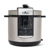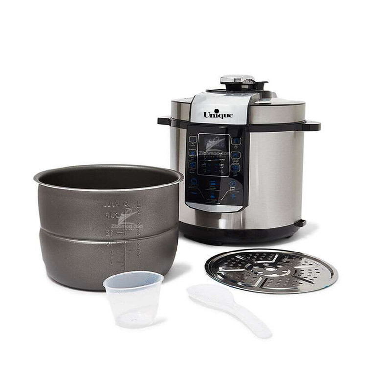 ظرفیت این دستگاه 6 لیتر است که برای یک خانواده غذای 12 نفر کفایت میکند. این زودپر فول دیجیتالی میباشد که می توانید مدت زمان پخت و درجه حرارت را در نمایشگر نشان میدهد. همچنین دکمه های آن لمسی میباشد که بسیار راحت میتوانید برنامه ها را تنظیم نمایید. با زود پز UNIQUE می توانید در بازه زمان کوتاهی غذایی خوشمزه بپزید. به وسیله این زودپز طبخ غذا را تسریع بخشید و پذیرای خانواده و مهمان های خود باشید. جنس این زود پز از استیل و سیلیکون می باشد که به راحتی تمیز می شود و لکه نمی گیرد. درب زود پز یونیک Unique بسیار محکم بوده و از خروج بخار جلوگیری می کند.