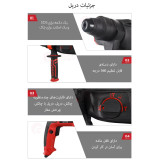 منبع اصلی قدرت این دستگاه، یک موتور الکتریکی با توان ۹۰۰ وات است. این توان بالا به یک مکانیزم ضربه زن قدرتمند اجازه میدهد تا در حالت چکشی، نرخ ضربهای برابر با ۵۱۰۰ ضربه در دقیقه تولید کند. این تعداد ضربه بسیار بالا، به دستگاه اجازه میدهد تا با سرعت و کارایی فوقالعادهای در سطوح سخت مانند آجر، سیمان و بتن نفوذ کند. سرعت گردش آزاد این دریل نیز به ۱۲۵۰ دور بر دقیقه میرسد که برای سوراخکاریهای سریع عملکردی عالی را فراهم میکند. منبع تغذیه این ابزار، برق مستقیم شهری با ولتاژ ۲۲۰ ولت است. این ویژگی تضمین میکند که دستگاه در تمام طول کار، قدرتی یکنواخت و بدون افت را ارائه دهد که برای کارهای سنگین و مداوم یک مزیت ضروری است.