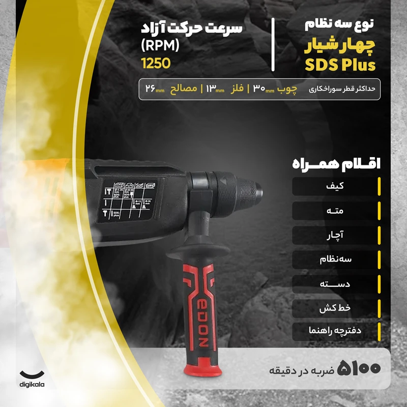 شاید برجستهترین ویژگی و بزرگترین مزیت رقابتی این مدل، مجموعه کامل و بینظیر لوازم جانبی آن باشد. این محصول به همراه یک رابط تبدیل سهنظام ارائه میشود که به شما اجازه میدهد تا سهنظام حرفهای چهارشیار یا SDS Plus دستگاه را به یک سهنظام آچارخور ۱۳ میلیمتری تبدیل کنید. این قابلیت به تنهایی، کارایی دستگاه را دوچندان میکند، زیرا به شما اجازه میدهد تا علاوه بر متههای تخصصی بتن، از انواع متههای معمولی گرد برای سوراخکاری در چوب و فلز نیز استفاده کنید. علاوه بر این رابط، مجموعه شامل سه عدد مته الماسه چهارشیار در سایزهای پرکاربرد ۶، ۸ و ۱۰ میلیمتر و دو قلم تخریب نوک تیز و نوک پهن است. این به معنای آن است که شما بلافاصله پس از باز کردن جعبه، تمام ابزارهای لازم برای شروع اکثر پروژههای تخریب و سوراخکاری در بتن را در اختیار دارید.