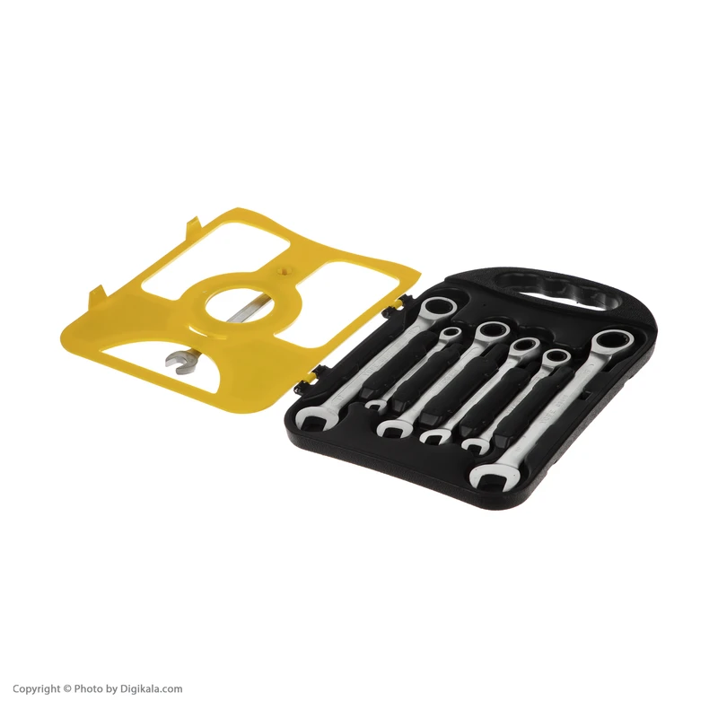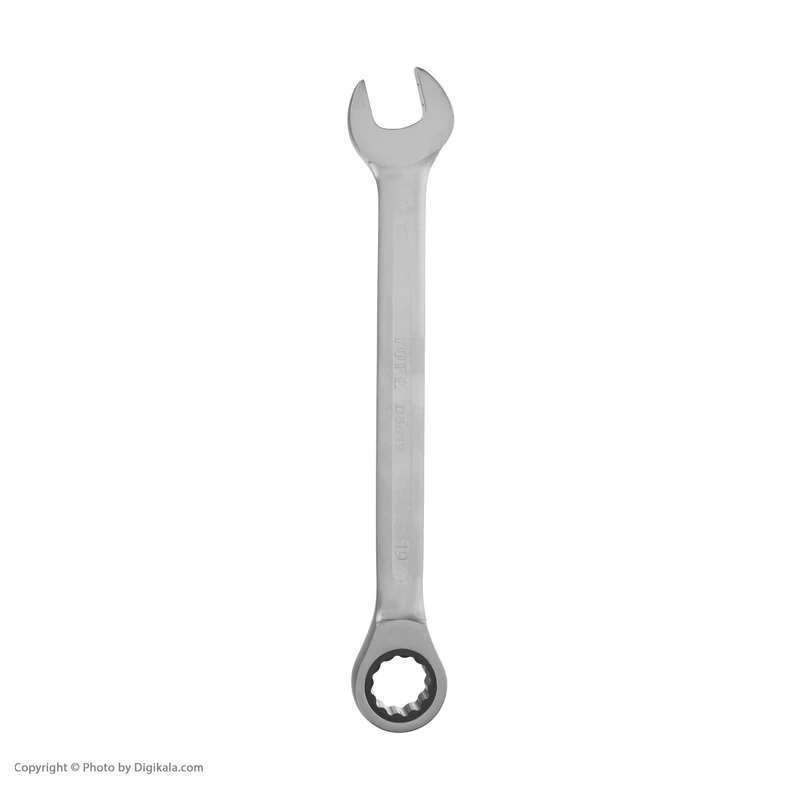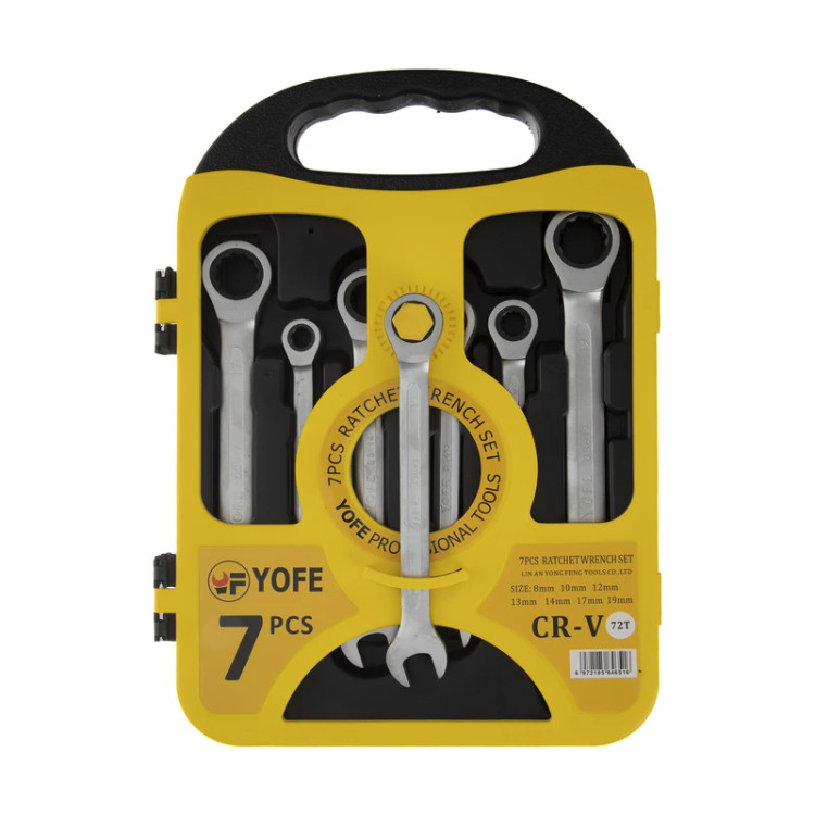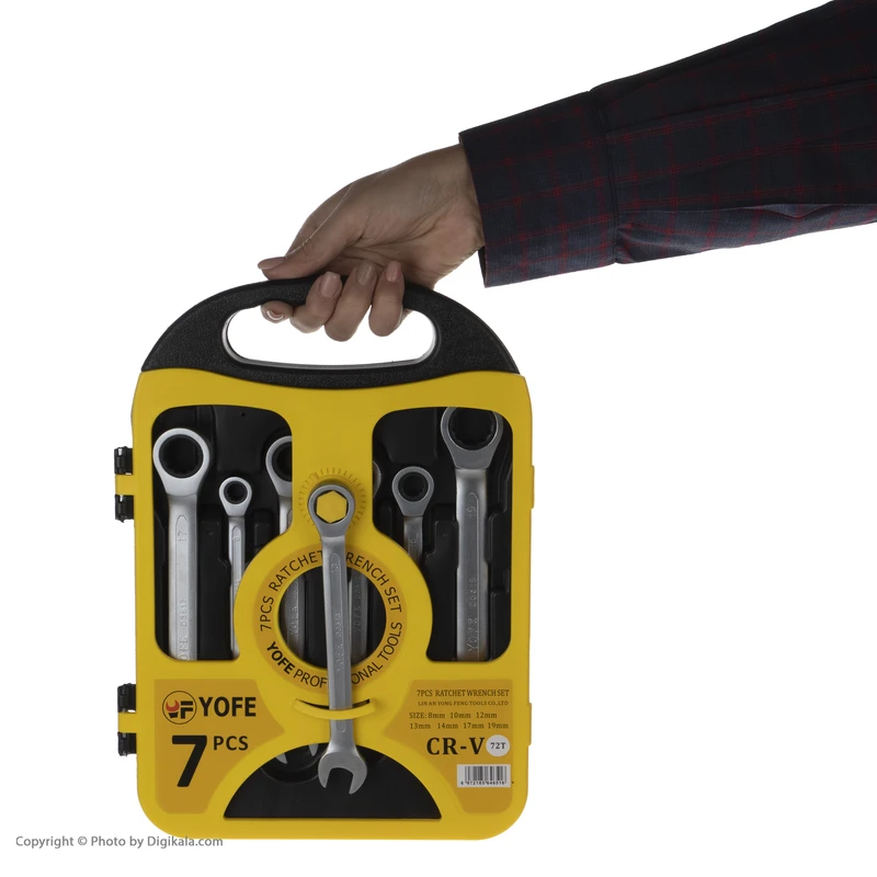 کاربردی ترین ابزاردستی که برای بازکردن یا بستن پیچ و مهرههای شش گوش استفاده میشود، گونههای مختلف آچار، به ویژه آچارهای تخت و رینگی است. مجموعه آچار یوف (YOFE) یک آچار دو سره است. این ابزار با عنوان « مجموعه 7 عددی آچار یک سرتخت یک سر جغجغه ای» دارای یک سر آچار تخت و یک سر آچار رینگی جغجغهای ثابت با شمارهای 8-10-12-13-14-17-19 است. برای ساخت این مدل از آلیاژ محکم مقاوم کروم وانادیوم استفاده شده است. این آلیاژ برای ساخت بسیاری از ابزارهای دستی مورد استفاده قرار میگیرد و مقاومت بالایی در برابر ضربه، فشار و حرکات پیچشی و کششی دارد. آچار یوف (YOFE) از استیل زد زنگ و زد خش ساخته شده (کروم وانادیوم) که با روکش مات پوشیده شده است. جغجغه این آچار دنده ریز است و برای بستن پیچ ها در جاهای تنگ بسیار مناسب است.