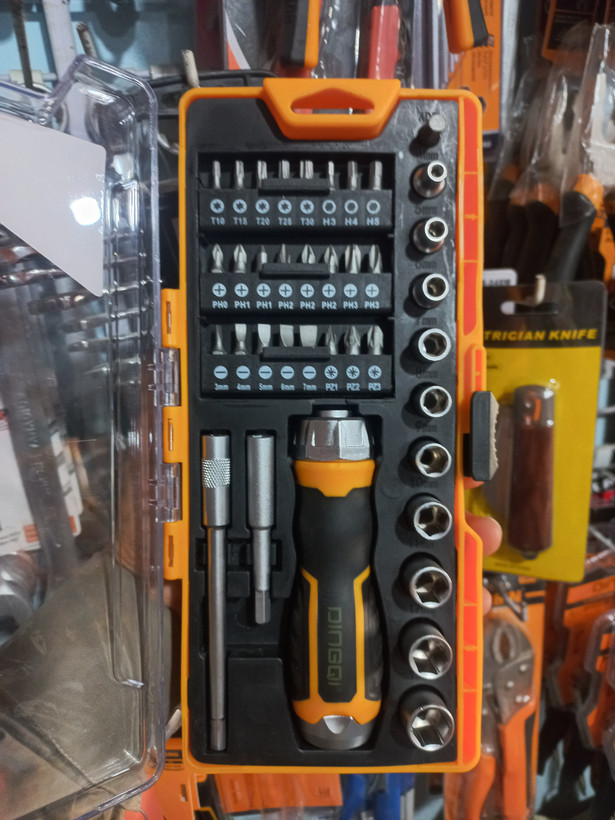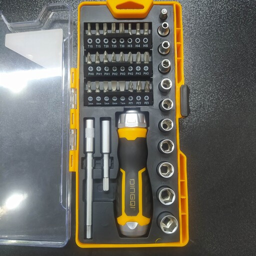 ست پیچ گوشتی جغجغه ای ۳۸ عددی دینگی شامل 24 عدد انواع سری پیچ گوشتی چهارسو ، دوسو ، ستاره ای ، شش گوش و بکس رابط و دسته رابط و دسته جغجغه ای ضد لغزش ساخته شده از جنس فولاد مقاوم کروم وانادیوم CRV