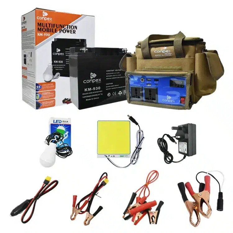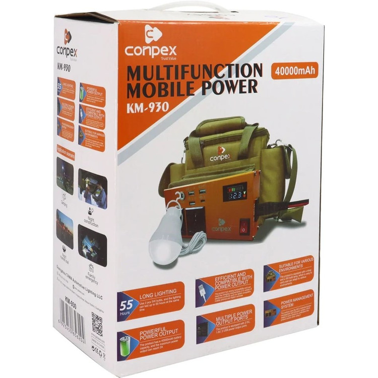 پاوربانک چندکاره کانپکس مدل KM 930 یک منبع انرژی بسیار قوی برای شارژ دستگاه های شما و یا حتی شوک دادن به خودرو در هنگام کمپینگ و مسافرت است. این محصول با ظرفیت 40000 میلی آمپر ساعت با حمل آسان می تواند همراه خوبی در سفرهای کمپینگ باشد.